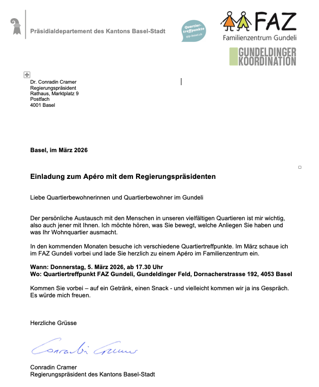 Am 5. März um 17:30Uhr ladet der Basler Regierungspräsident, Conradin Cramer, die Quartierbevölkerung zum Apéro und Austausch ein. Wo: Familienzentrum FAZ, Gundeldinger Feld Wann: 5. März 26 ab 17:30Uhr