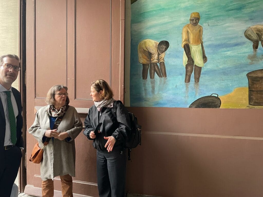Anschliessend führte Beatrice Isler zur Liegenschaft Güterstrasse 141, der ehemaligen Coruba Rum-Fabrik, und erzählte von der Geschichte der Coruba Rum Company. Besonders beeindruckend fanden die Spaziergänger:Innen die Wandmalereien im Durchgang der Liegenschaft.