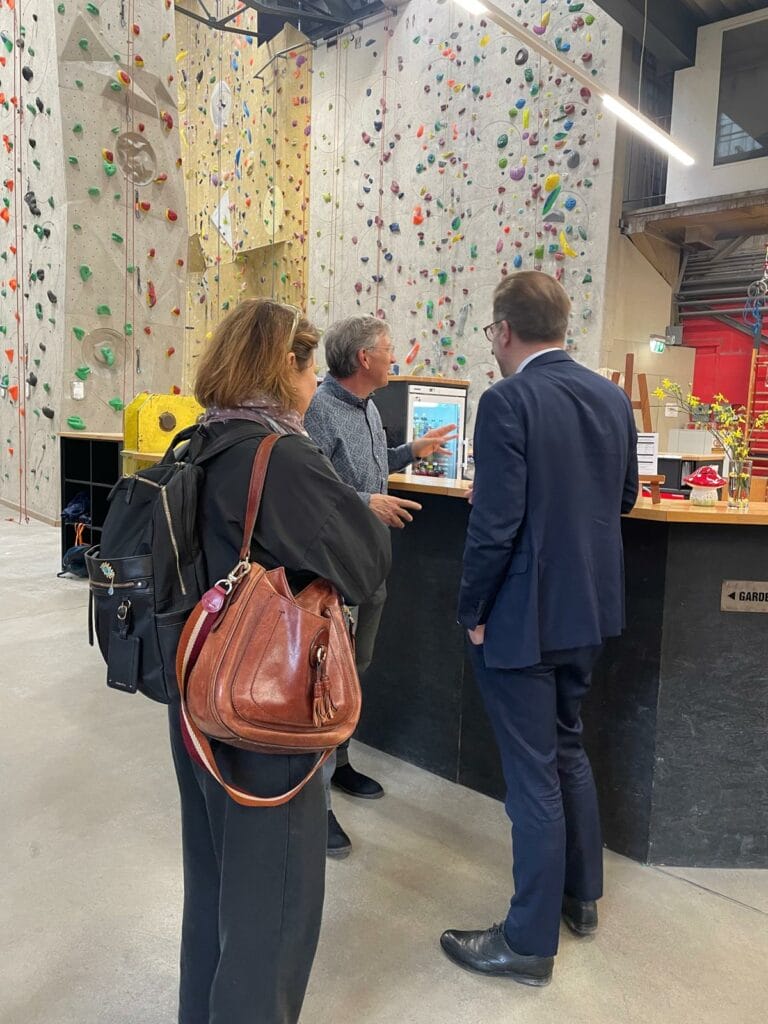 Schliesslich ging es weiter zum Gundeldingerfeld, wo die Spaziergruppe die Kletterhalle K7 besichtigte. Léonie Müller-Haller und Gabriela Brüderlin erläuterten die Entwicklung des Areals und betonten die Vielfalt der Angebote für die Quartierbevölkerung. Das Gundeldinger Feld etablierte sich als urbaner, lebendiger und integrativer Ort im Quartier und ist nicht mehr wegzudenken.