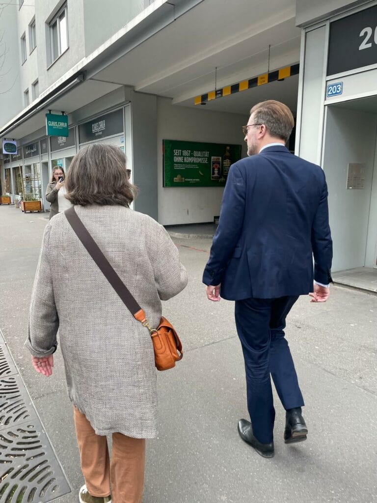 Nach einer halben Stunde gings dann aber auch schon weiter. Gutausgerüstet mit Halbschuh und Sonnenbrille gings zum Frühlingsspaziergang durch das Quartier, begleitet von Gundeliexpertin Beatrice Isler, Geschäftsleiterin Gundeldinger Koordination Léonie Müller-Haller und auch Gabriela Brüderlin, die die Spazierenden abwechselnd mit Hintergrundinformationen und Anekdoten aus dem Gundeli versorgten.